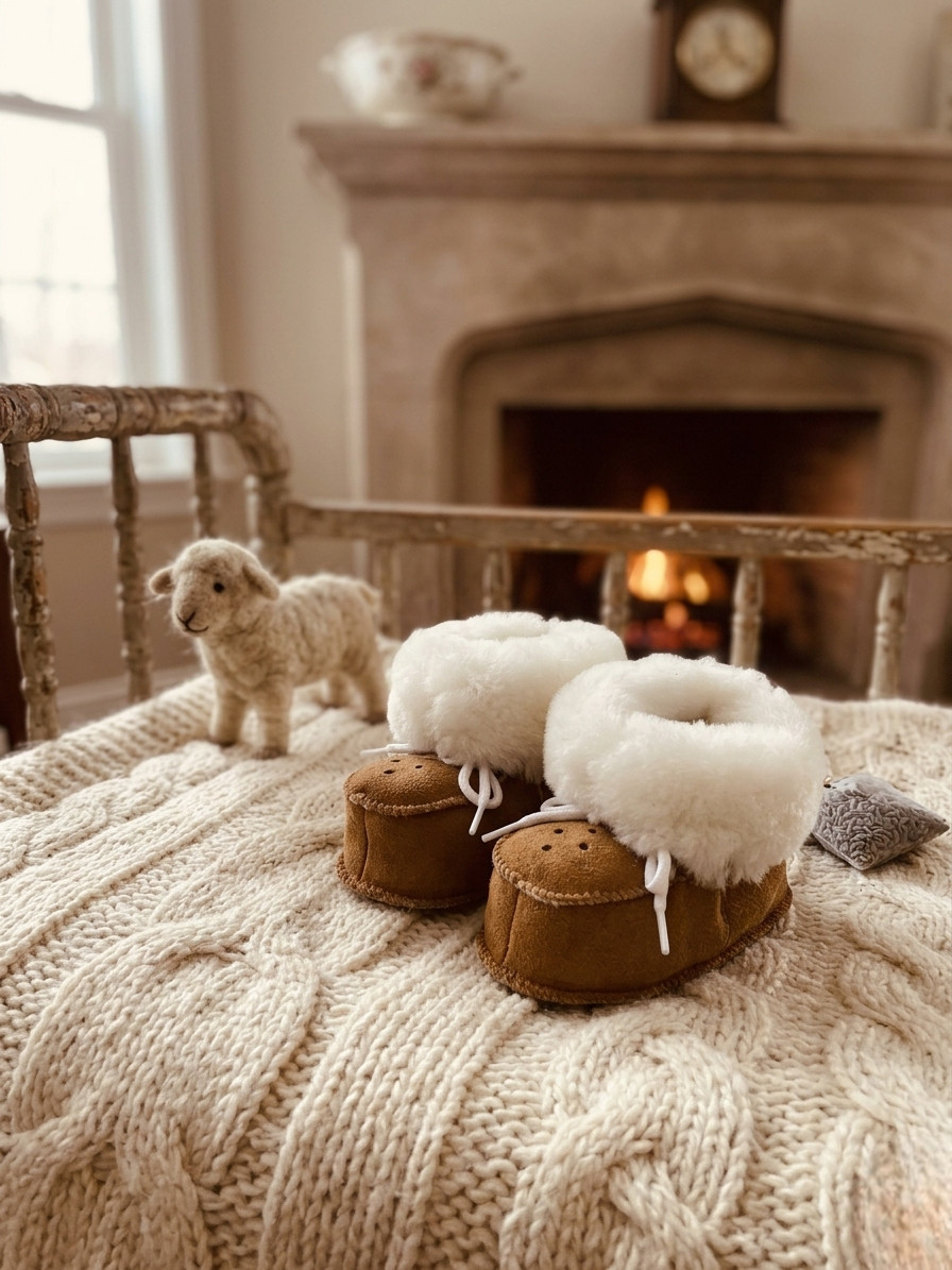 Chaussons bébé en peau de mouton, couleur camelle très confortable grâce à sa laine naturelle.