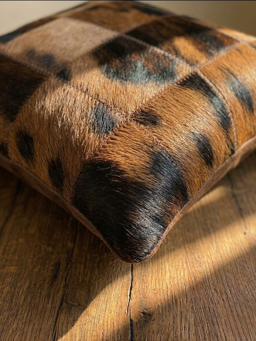 Coussin patchwork vache normande moka fabriqué en véritable peau de vache Française.