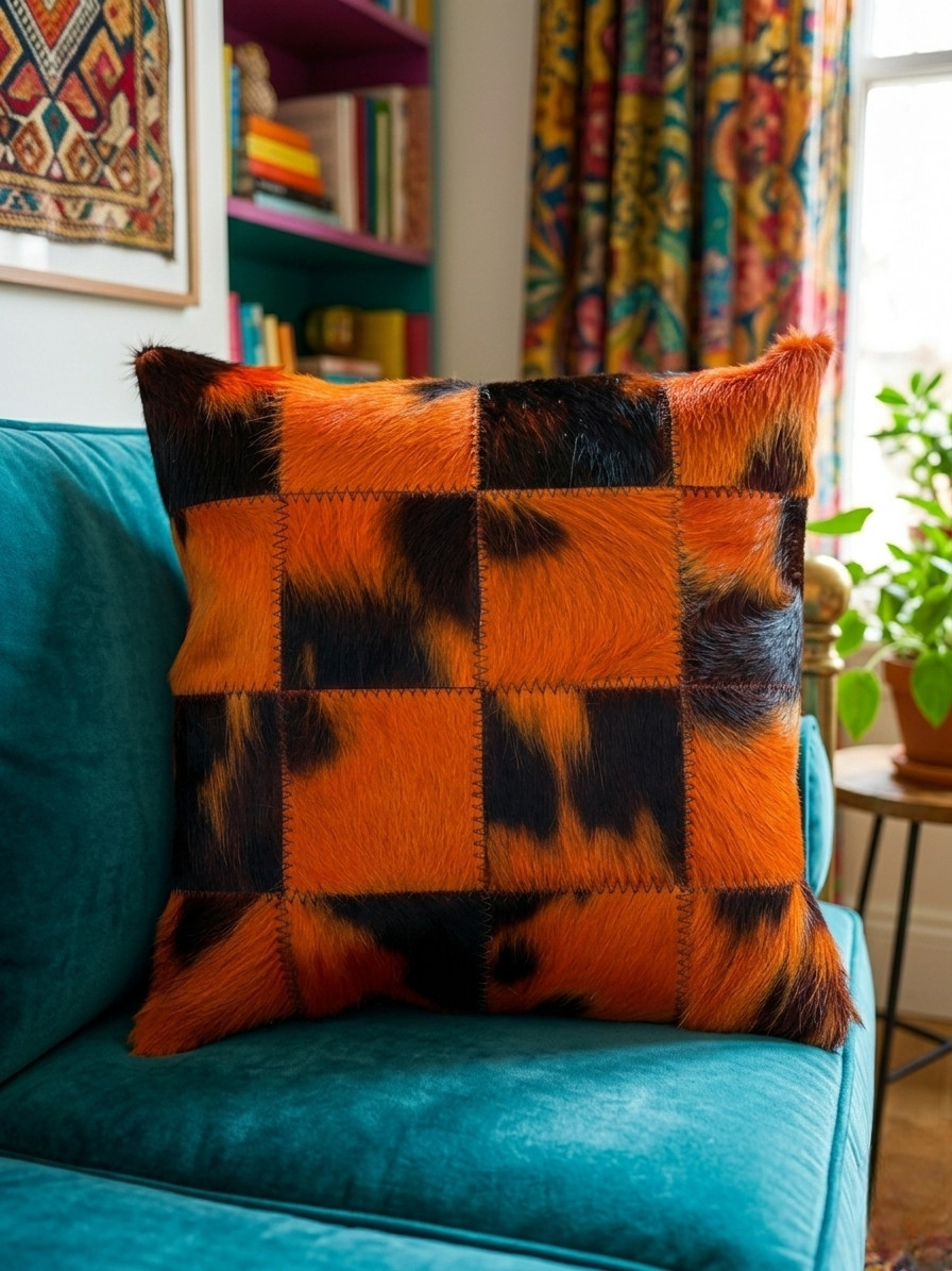 Coussin patchwork vache normande orange fabriqué en véritable peau de vache Française.