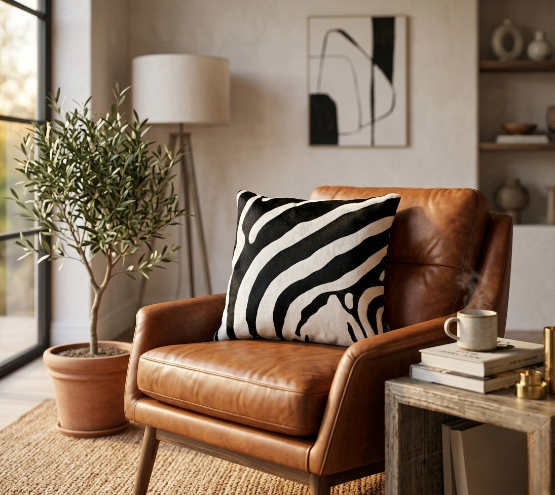 Coussin en peau de vache zèbre blanc fabriqué en véritable peau de vache française.