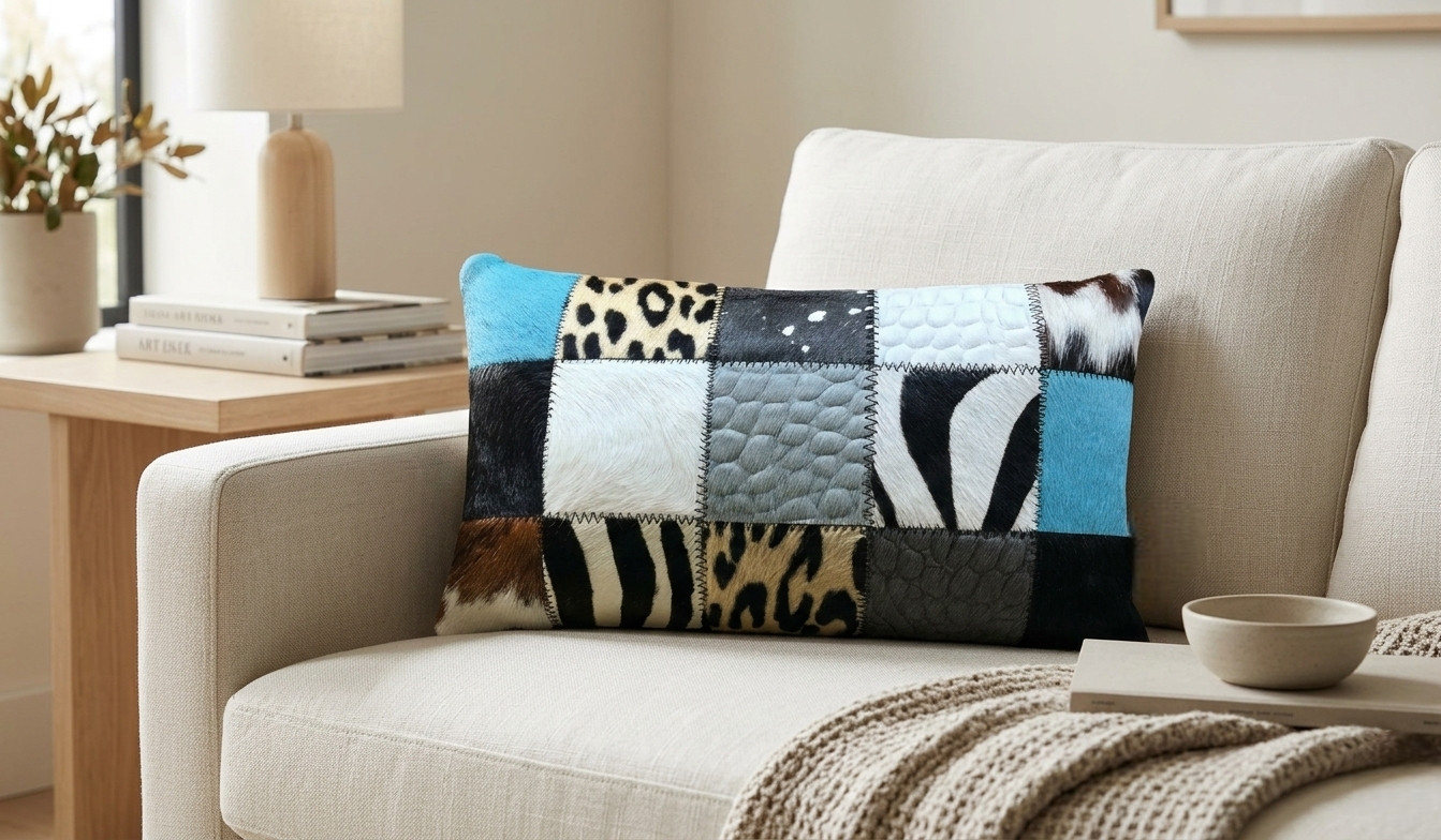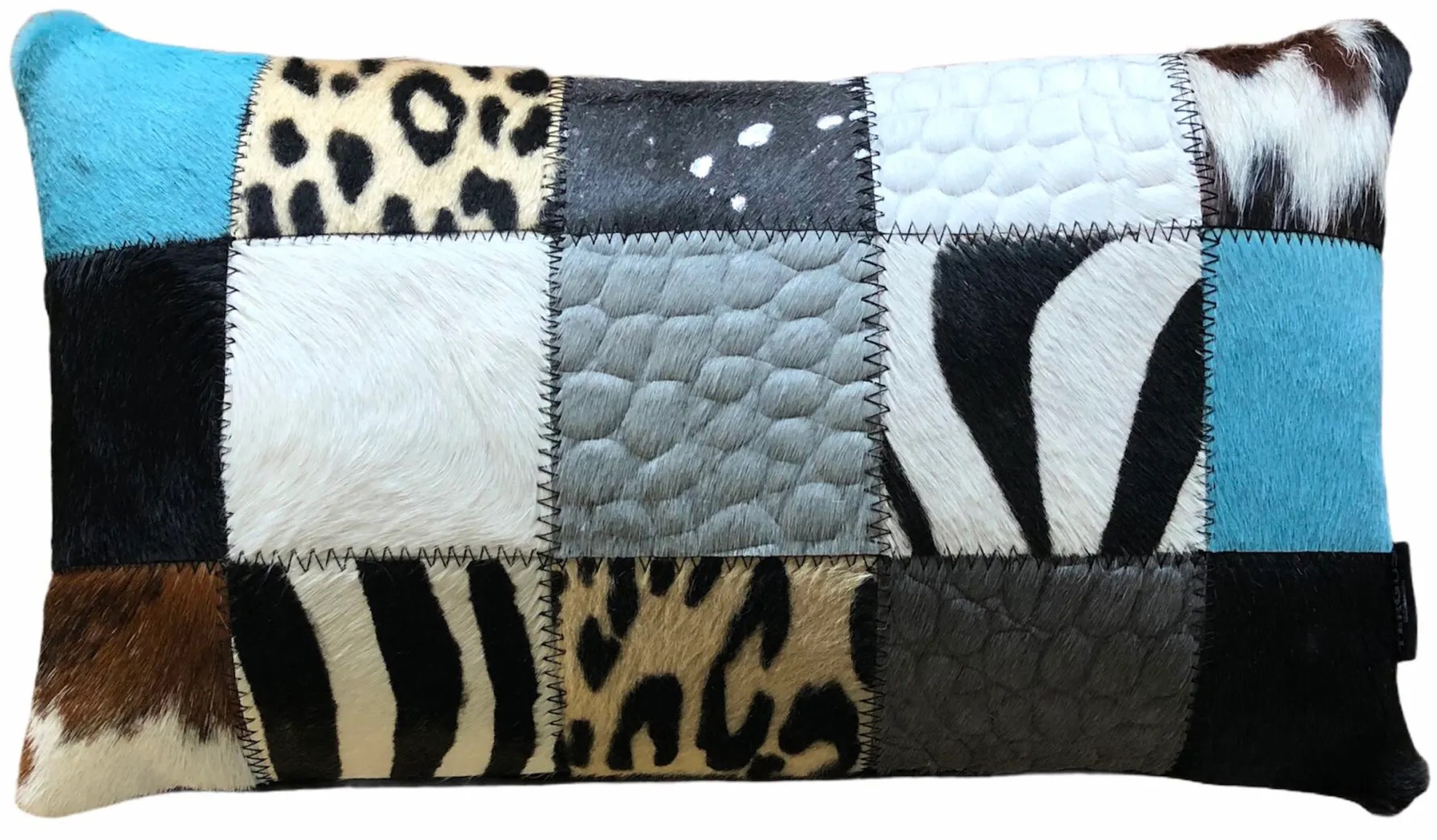 Coussin rectangle peau de vache mixte turquoise patchwork fabriqué en véritable peau de vache française.