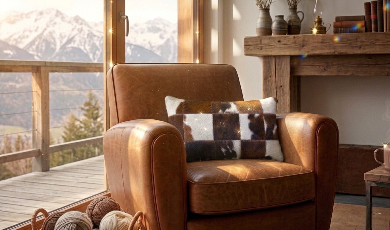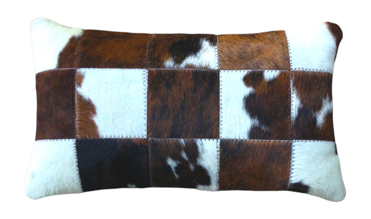 Coussin rectangle peau de vache normande tacheté fabriqué en véritable peau de vache française.