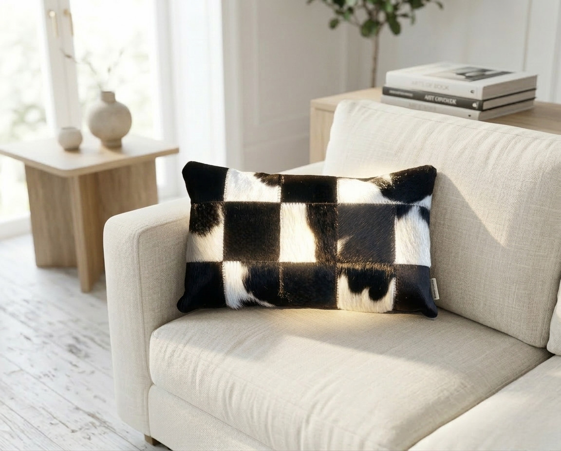 Coussin rectangle peau de vache noir et blanc fabriqué en véritable peau de vache française.
