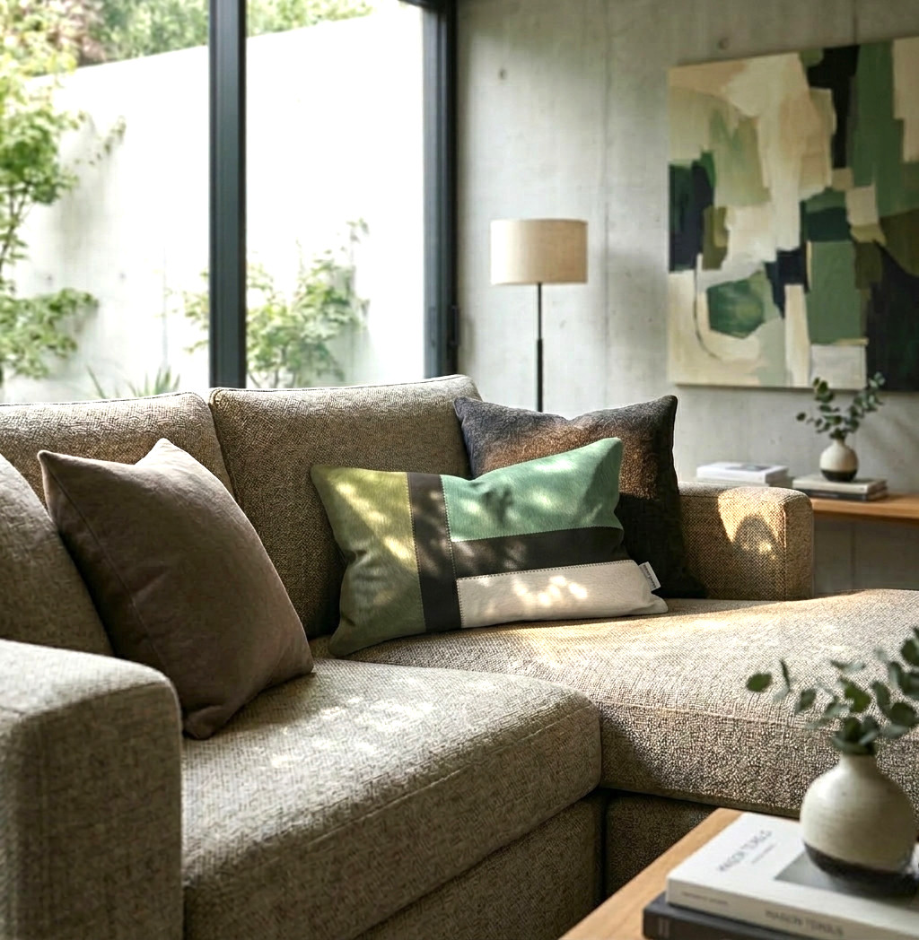 J’ai acheté une peau de vache kaki puis quelques jours après ce coussin… j’ai bien fait car l’ensemble se marie très bien