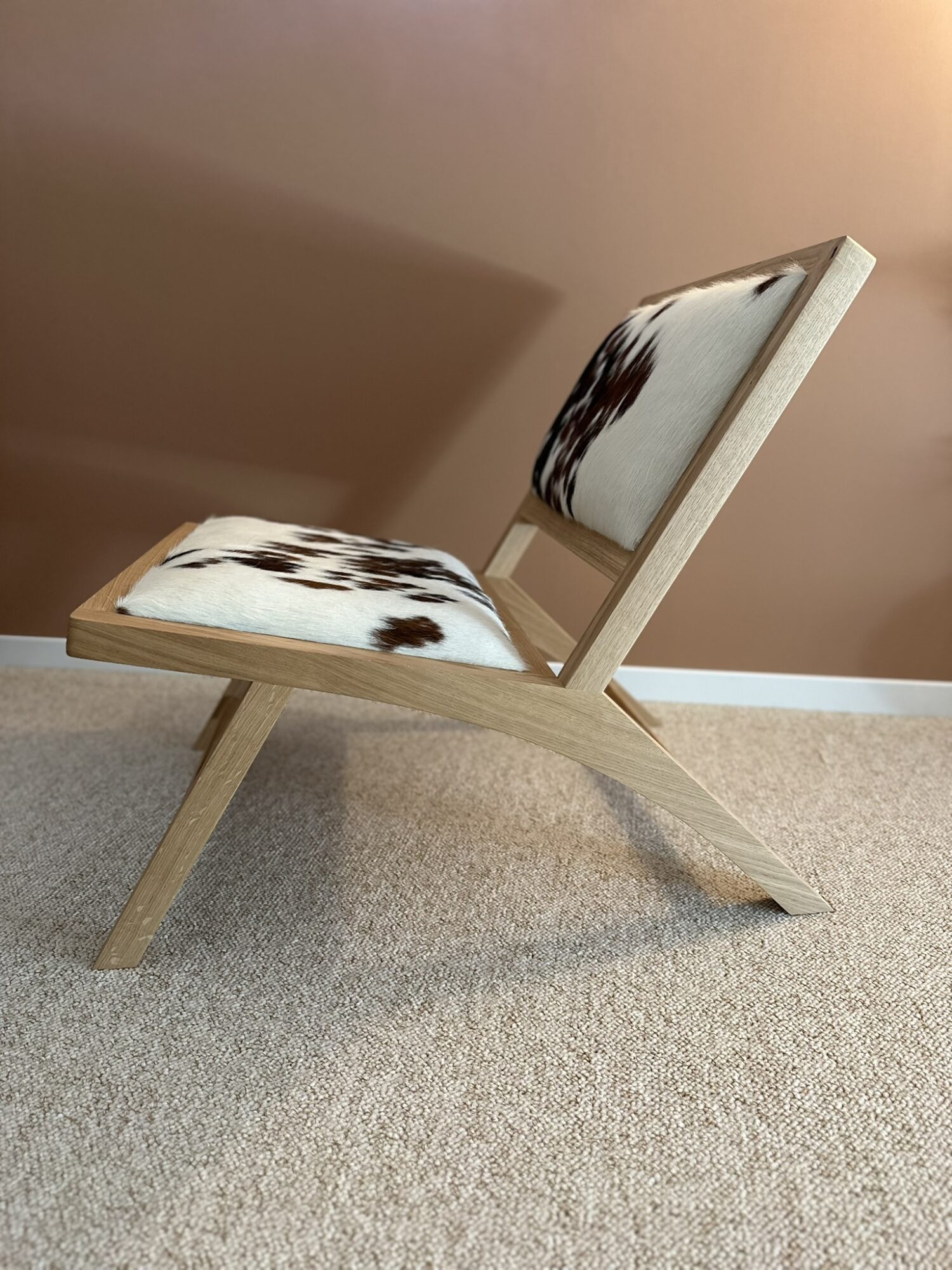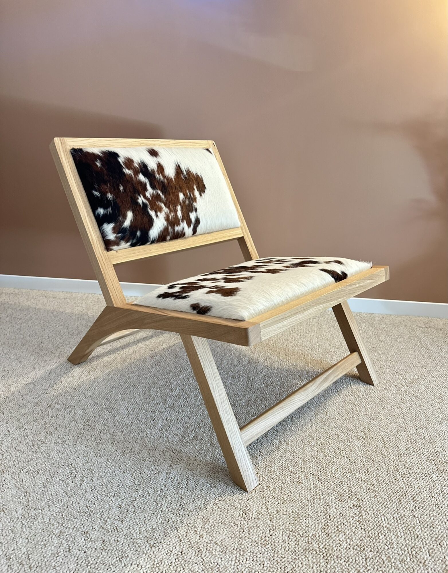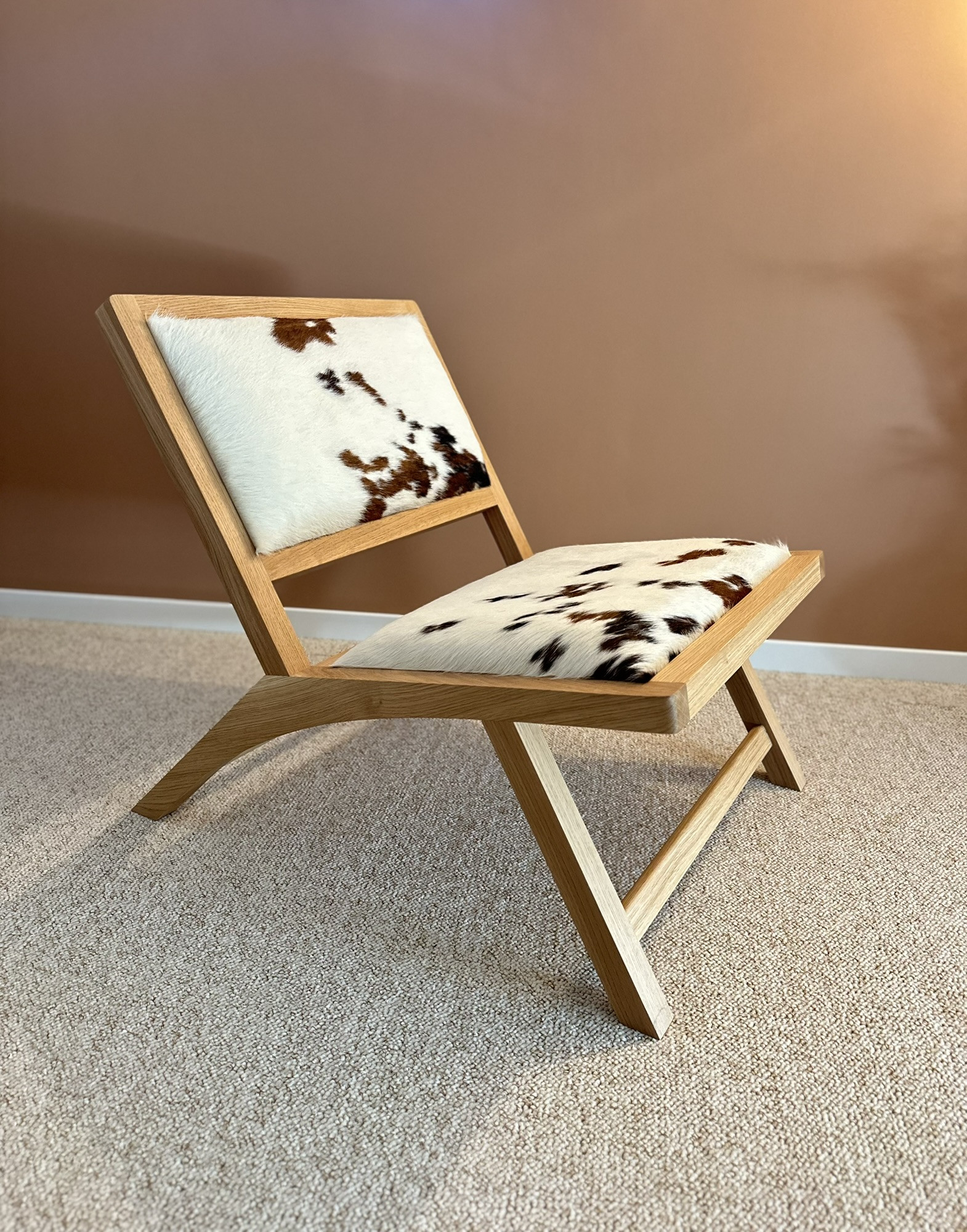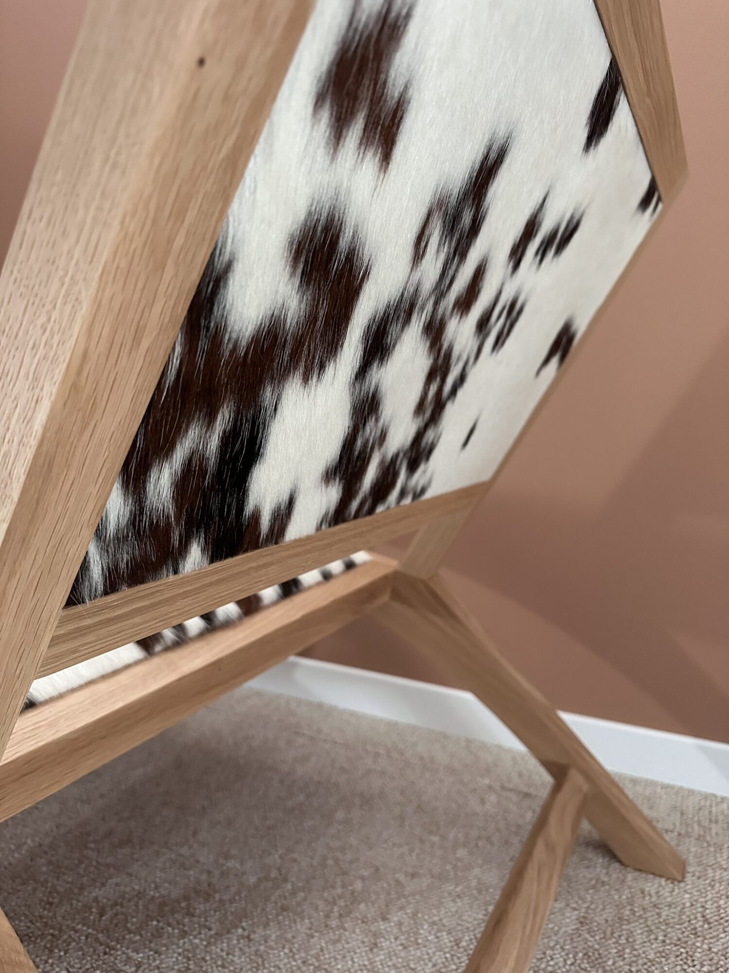 Ce fauteuil en peau de vache allie design contemporain, matières naturelles et savoir-faire artisanal français. Sa structure en bois massif aux lignes épurées met en valeur une assise et un dossier habillés de peau de vache recyclée, soigneusement sélectionnée pour son grain et ses nuances naturelles.