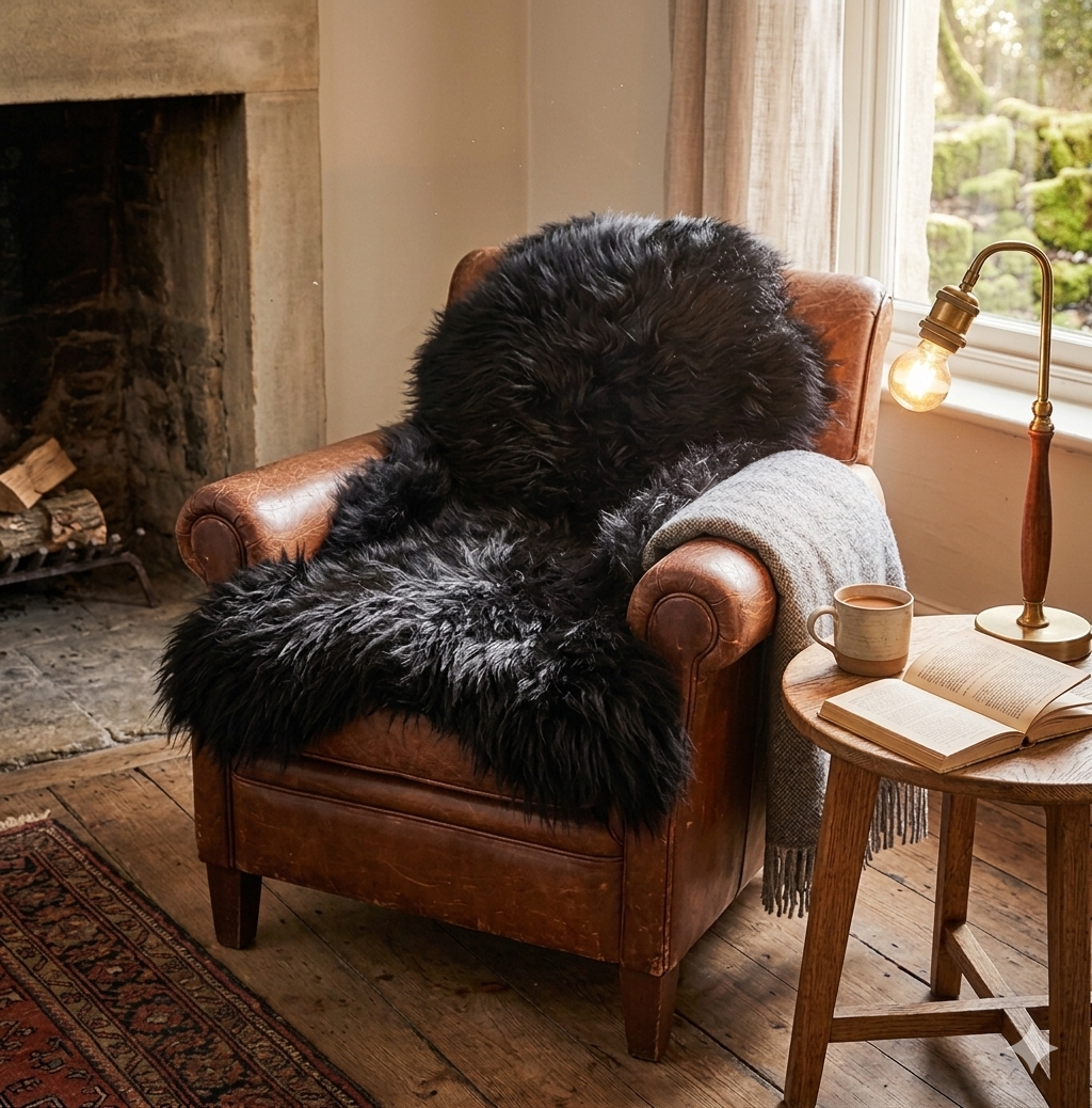 Véritable peau de mouton islandaise noire naturelle poil long.