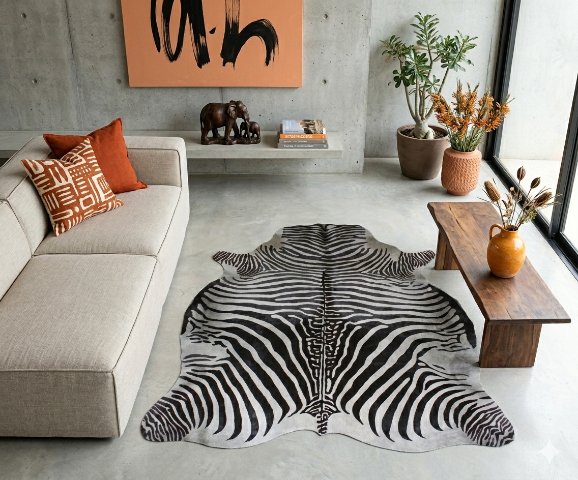 Véritable peau de vache Charolaise naturellement blanche. Nous lui avons appliqué ici un pochoir effet Zèbre sur une teinture grise claire.