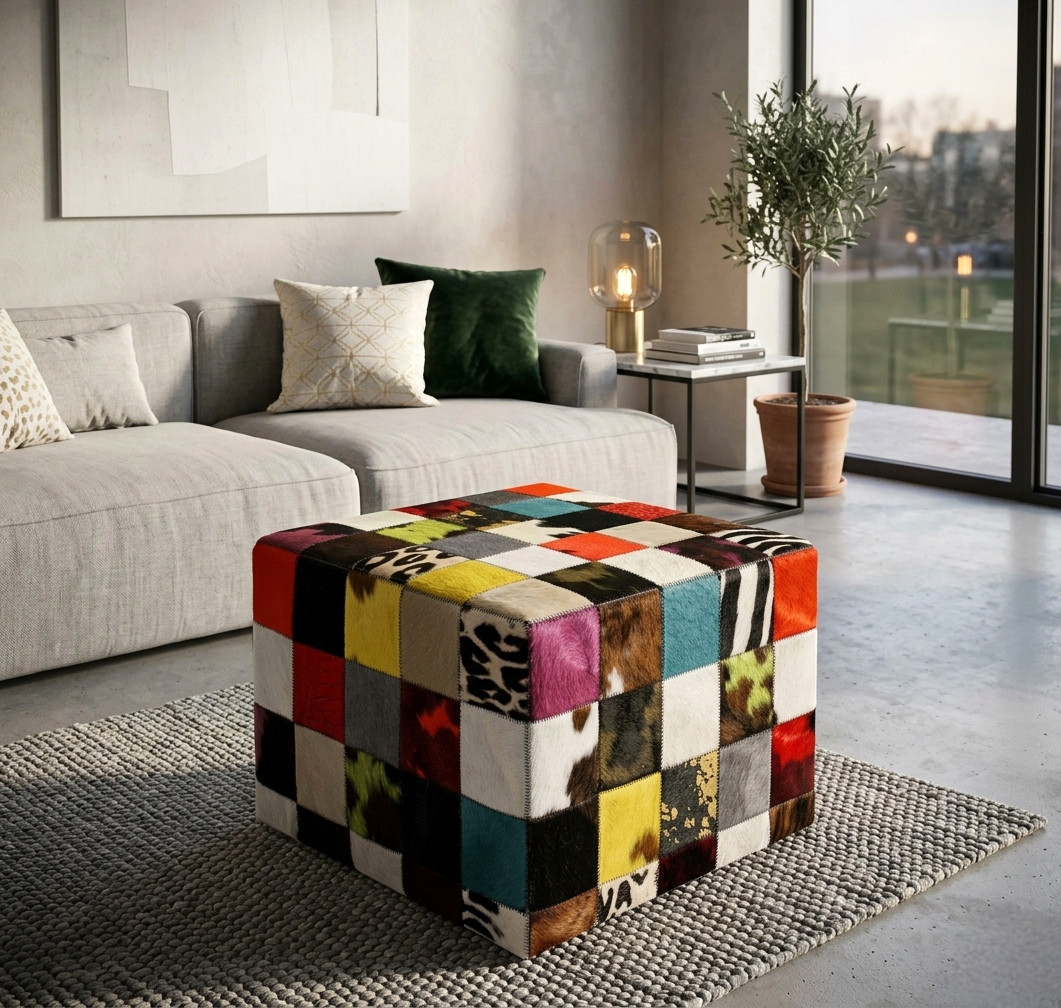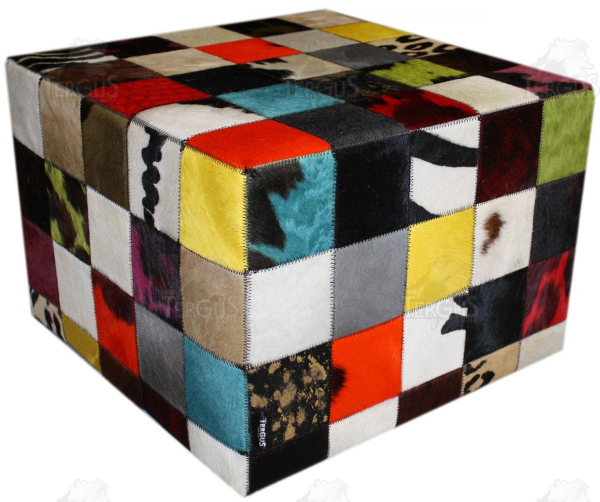 Pouf peau de vache patchwork multicolore habillé ici d’une housse composée de petits carrés de peau de vache de 10/10cm.