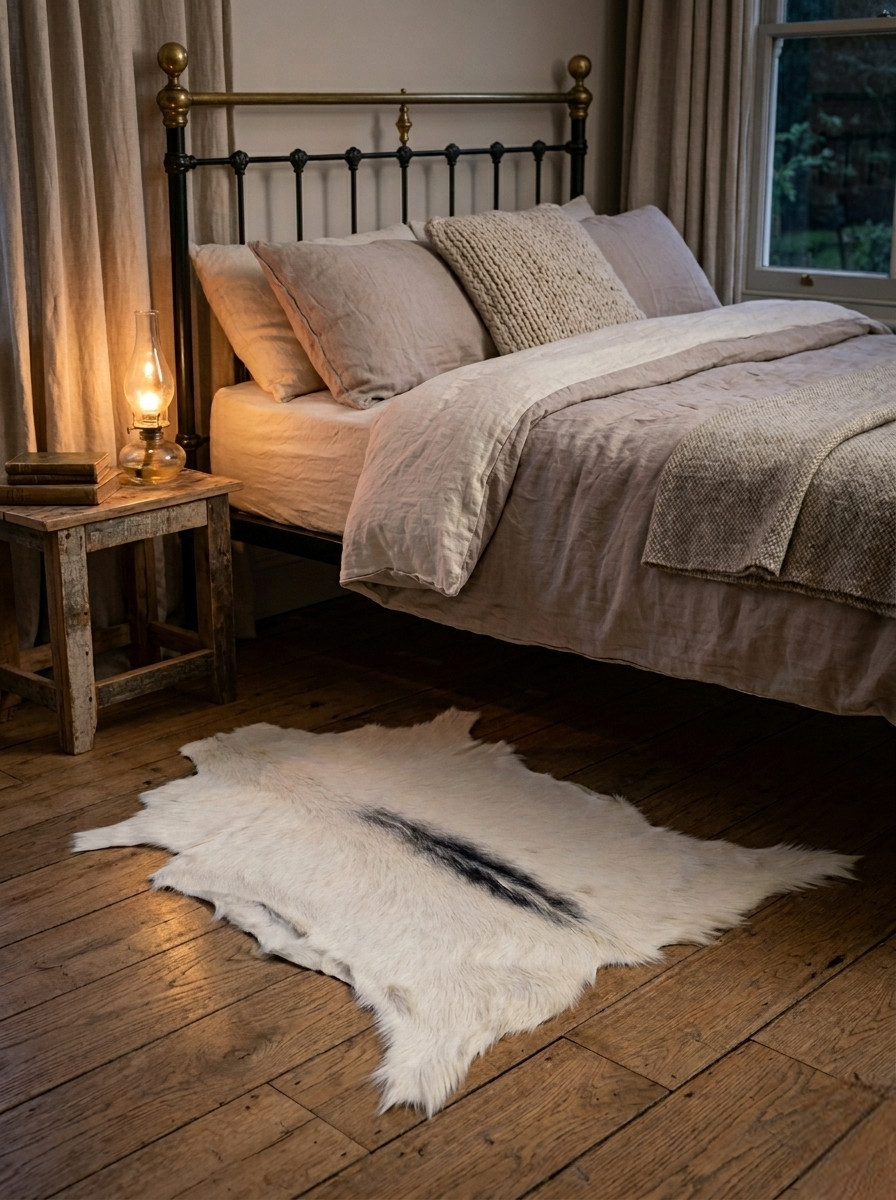 Le petit tapis chèvre naturel de couleur blanche pour une décoration rustique chic.