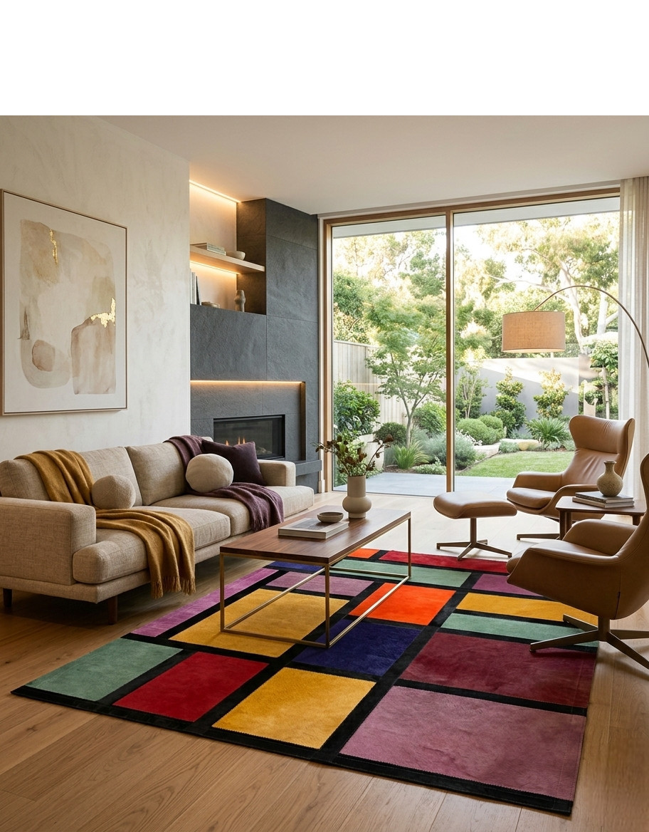 Tapis cuir type “MONDRIAN” grands panneaux dans les tons orange, terracotta, moutarde, amande, jaune..