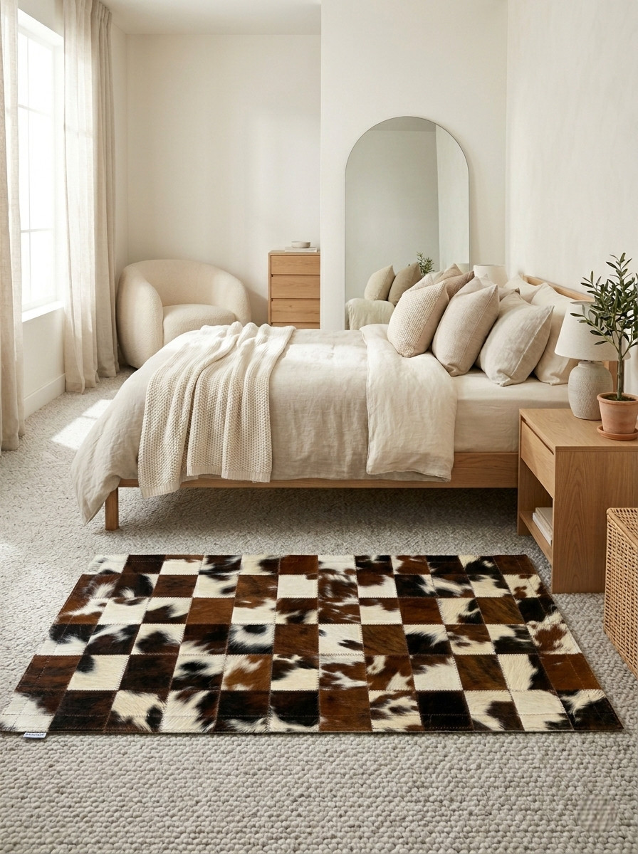 Descente de lit en cuir recyclé motif normande marron & blanc.