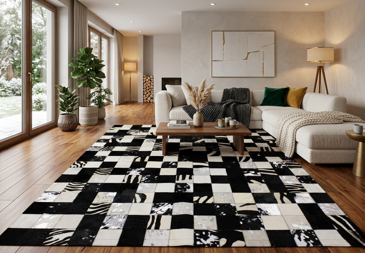 Tapis peau de vache patchwork multicolore noir en véritable peau de vache design avec des mélanges de noir uni, blanc uni, noir acide argent, blanc acide argent et zèbre blanc en carré de 10×10 cm. Son petit plus: Véritable peau de vache française, recyclée et valorisée par nos artisans tanneurs. Création Maison Tergus