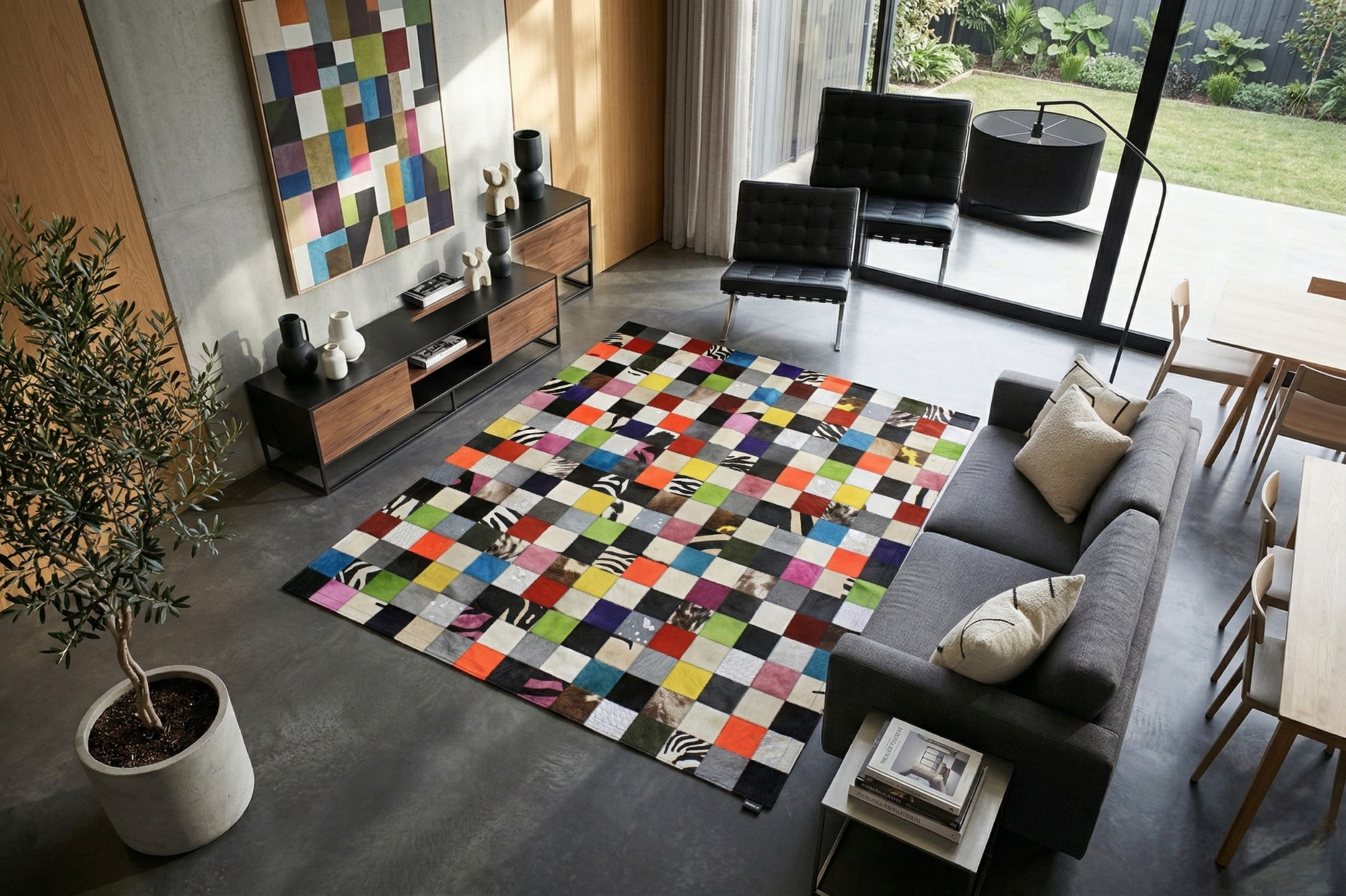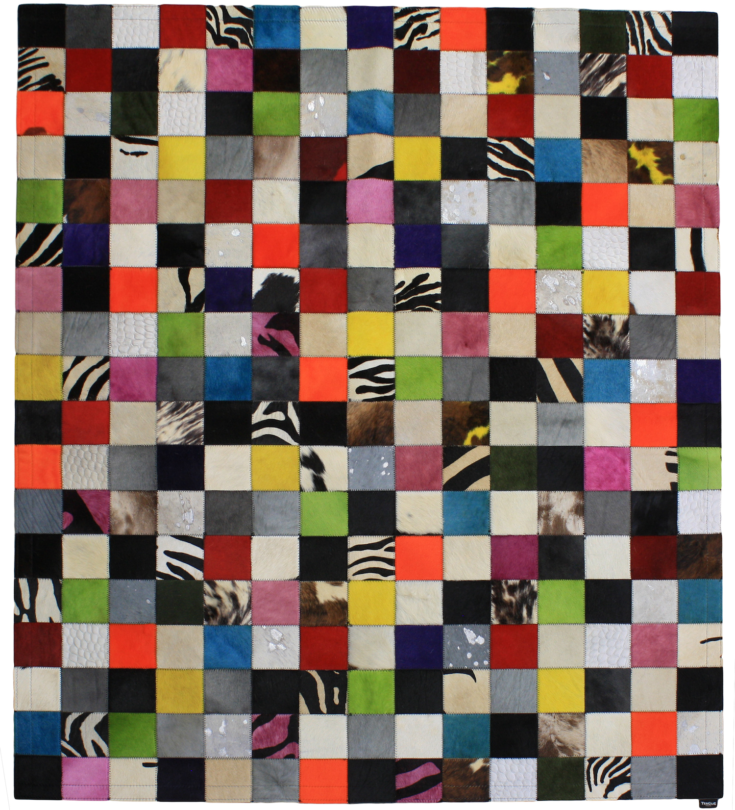 Tapis peau de vache rond patchwork multicolore avec tout type de matière mélangé: naturel, teinté, imprimé, acidé, pressé… en carré de 10×10 cm.