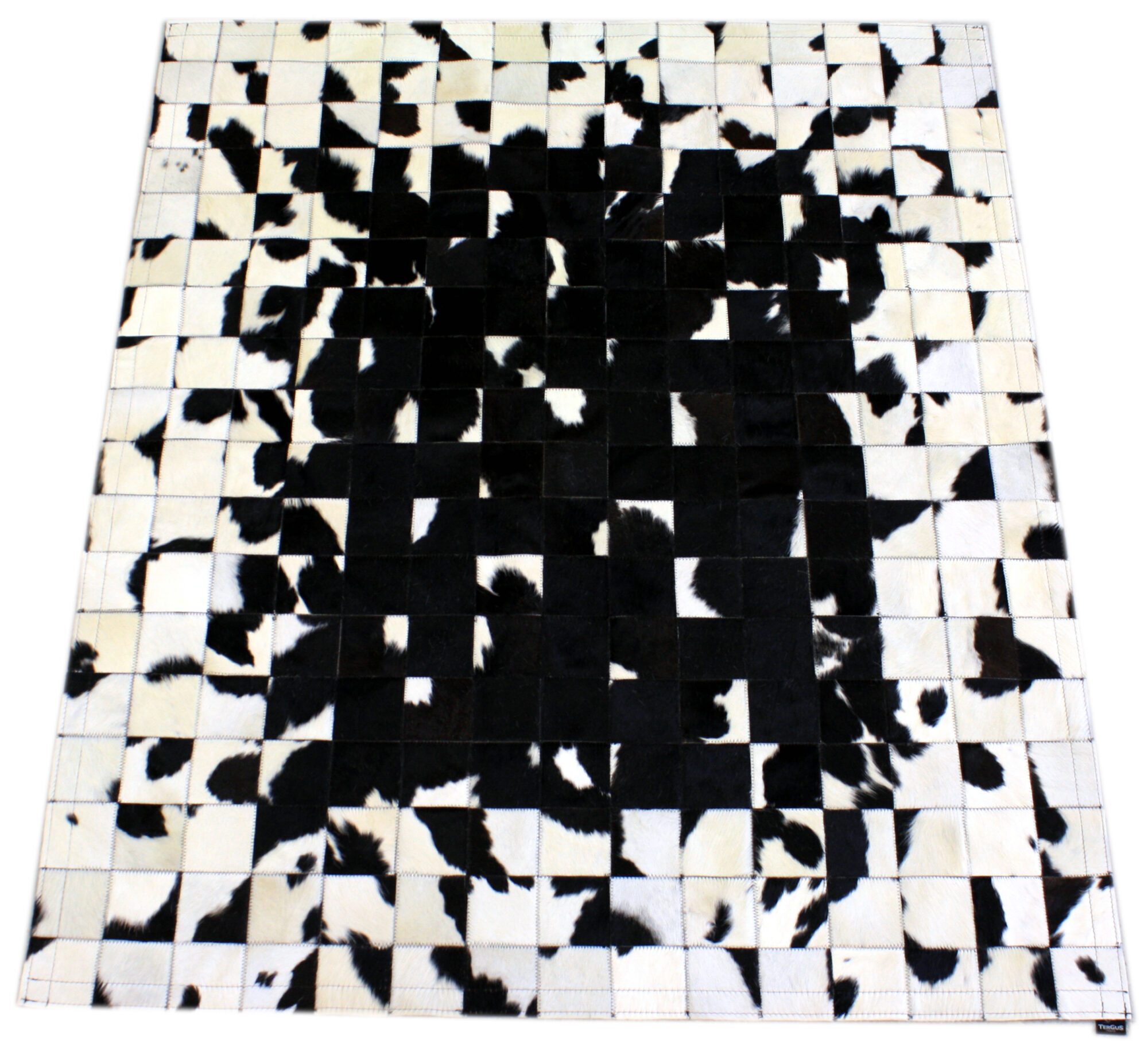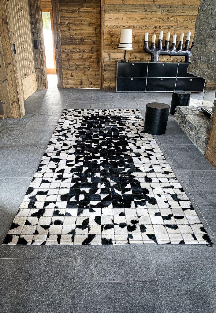 Tapis noir et blanc patchwork design fabriqué à partir de véritables peaux de vache Prim’Holstein recyclées et revalorisées dans nos ateliers en Auvergne