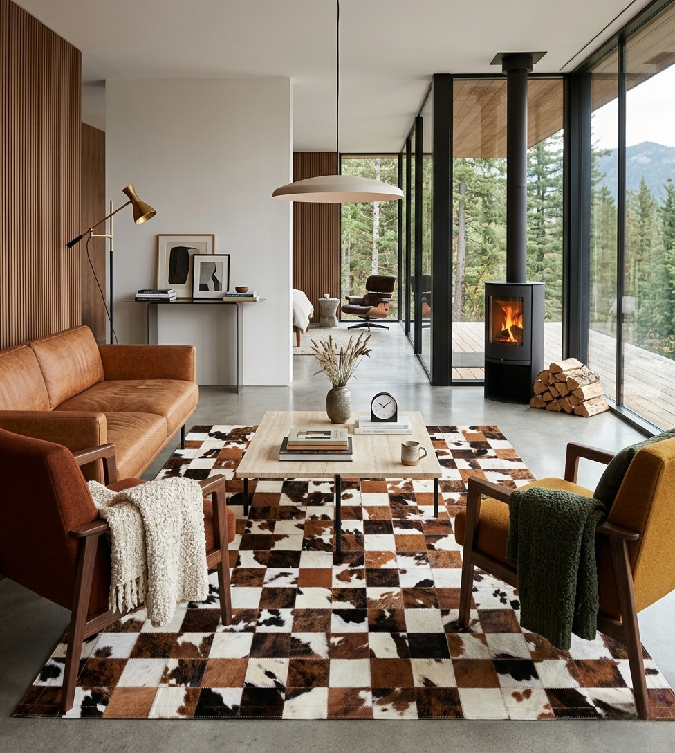 Tapis Vache en cuir recyclé motif normande marron & blanc.