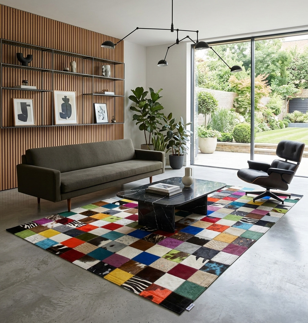 Tapis vache JOY patchwork multicolore grands carrés. Il saura vous séduire avec son design, son mélange de matières et ses couleurs modernes.
